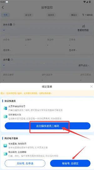 3、按需选择绑定方式,协议快递员可扫码,网点电子面单则选有账号绑定。