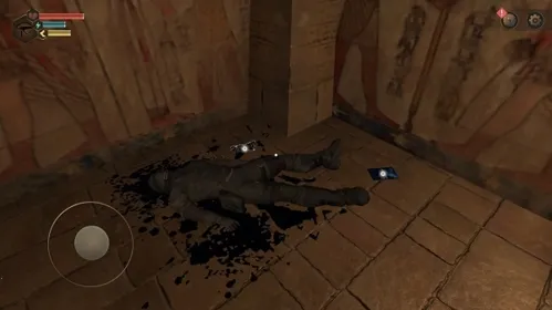 5、在探索墓室场景的过程中,会出现发光的物品,靠近并点击它们,可以获得相应的线索,同时也有武器和装备可用。